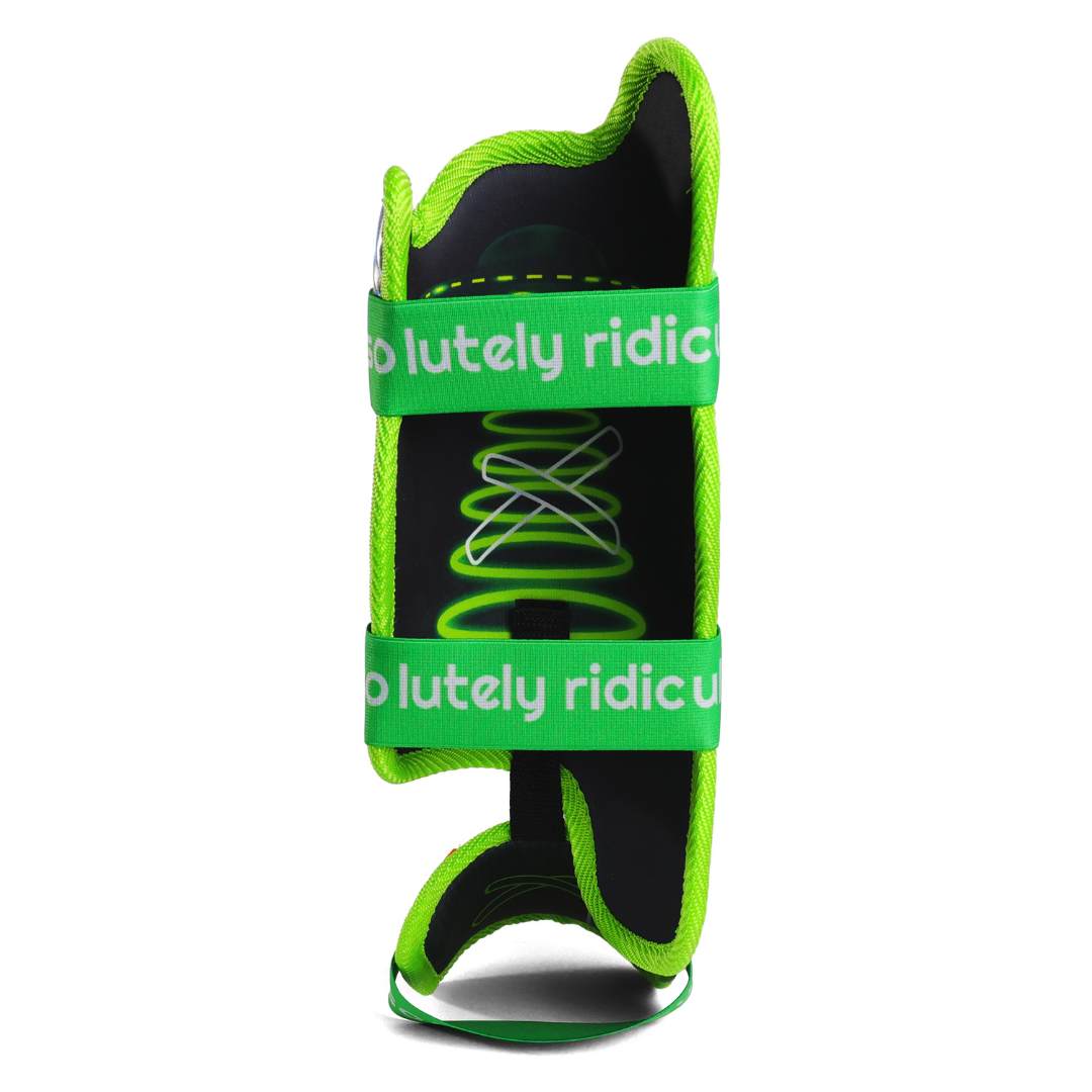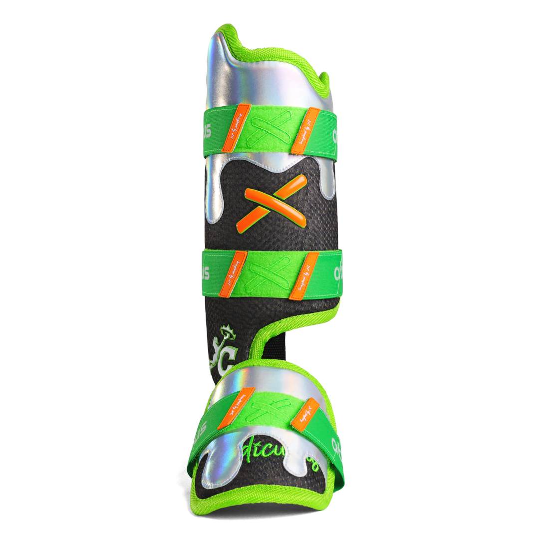 The Beam Me Up leg guard features duel layered sponge absorption mesh lining, iridescent drip and full ankle coverage for both right handed (RHB) and left handed batters (LHB) with velcro straps for maximum comfort and fit.