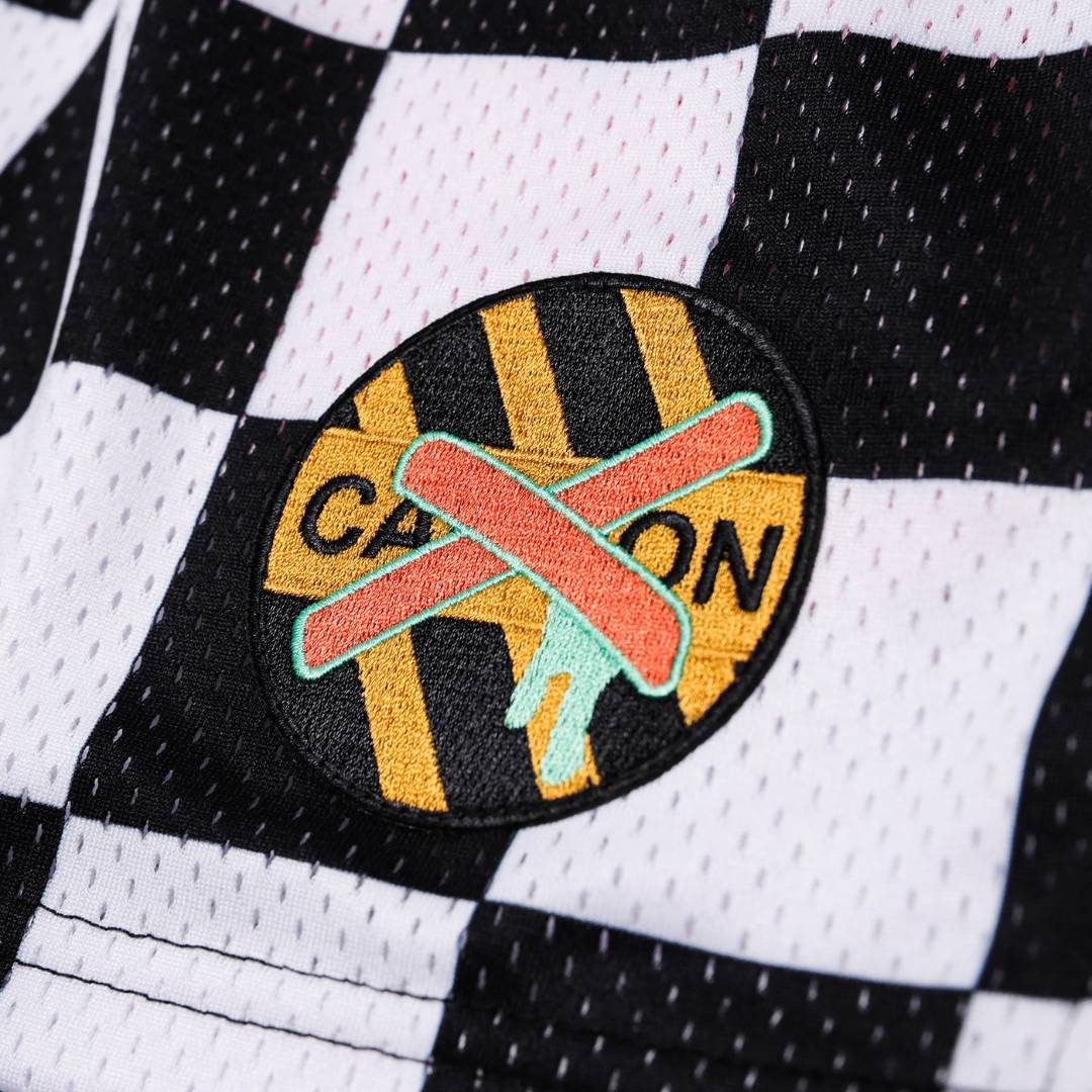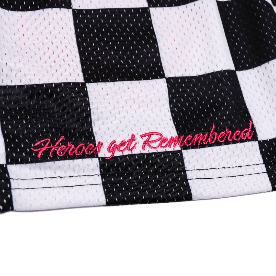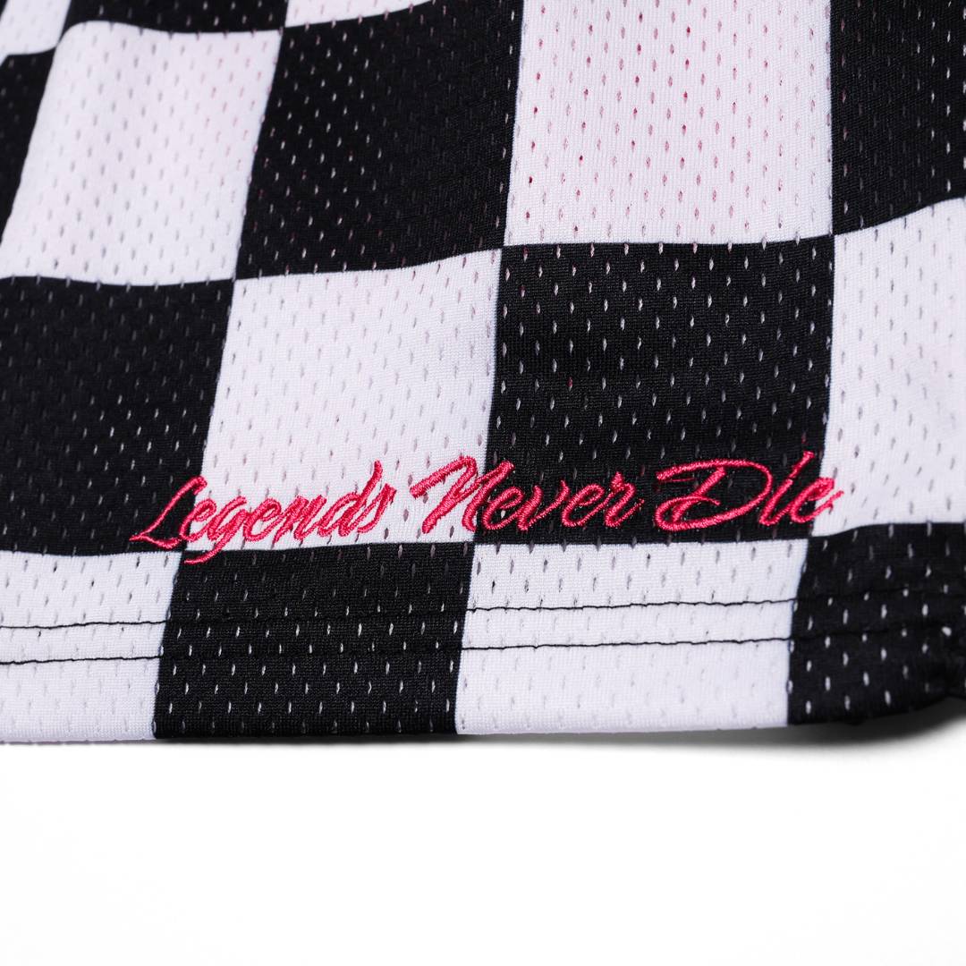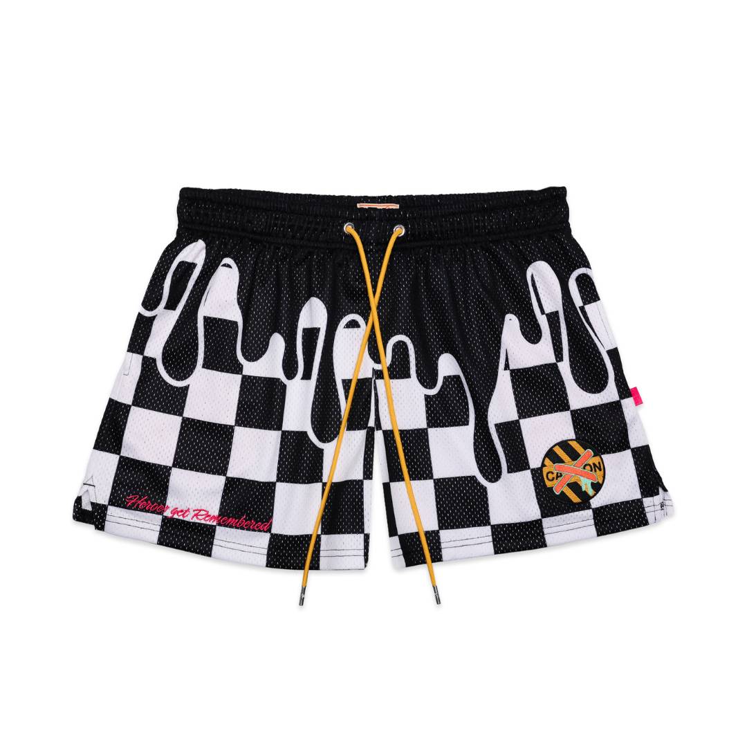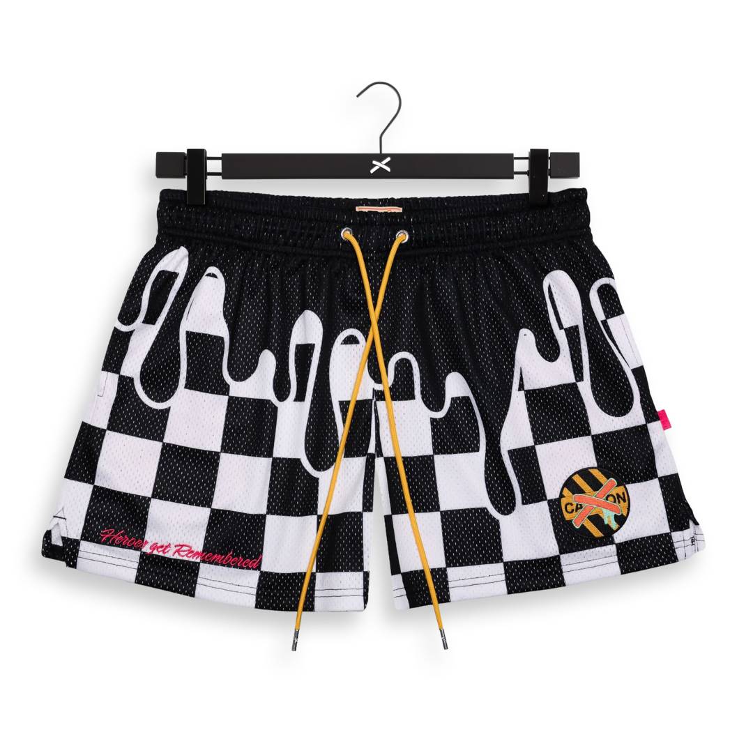 Premium tipped drawstrings, debossed eyelets, and the breathable mesh all come together with an expressive black-and-white checker pattern, high-contrast drip, and hot-pink embroidery in the stitching. A loud metallic-inspired patch completes the look, reinforcing that these shorts bring out a confident, performance inspired look.