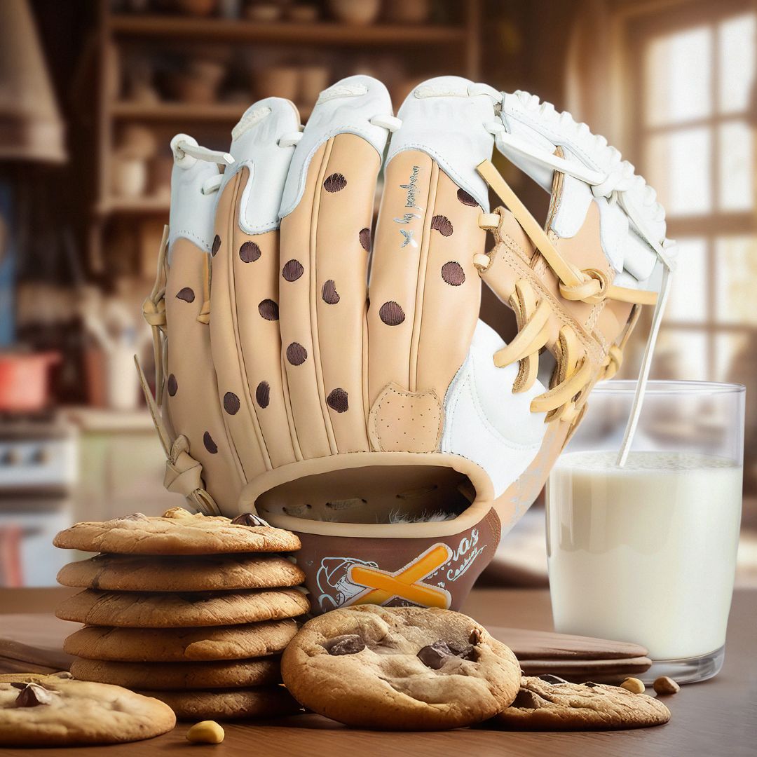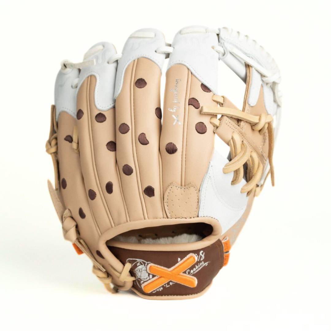 Art meets world class performance. Chocolate Chip Cookies: Inspired by X's Grandma comes the Milk and Cookies (Chocolate Chip Edition) Glove. With savory chocolate chip embroidery, a soft cookie shell, and a cookie finger pad dripping in milk to bring to life this milk dripping delicatessen from X's Grandma's recipe book.