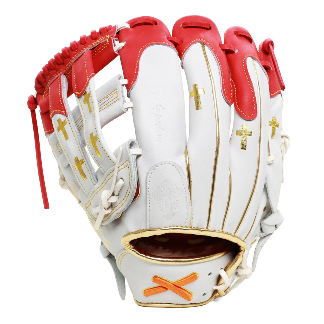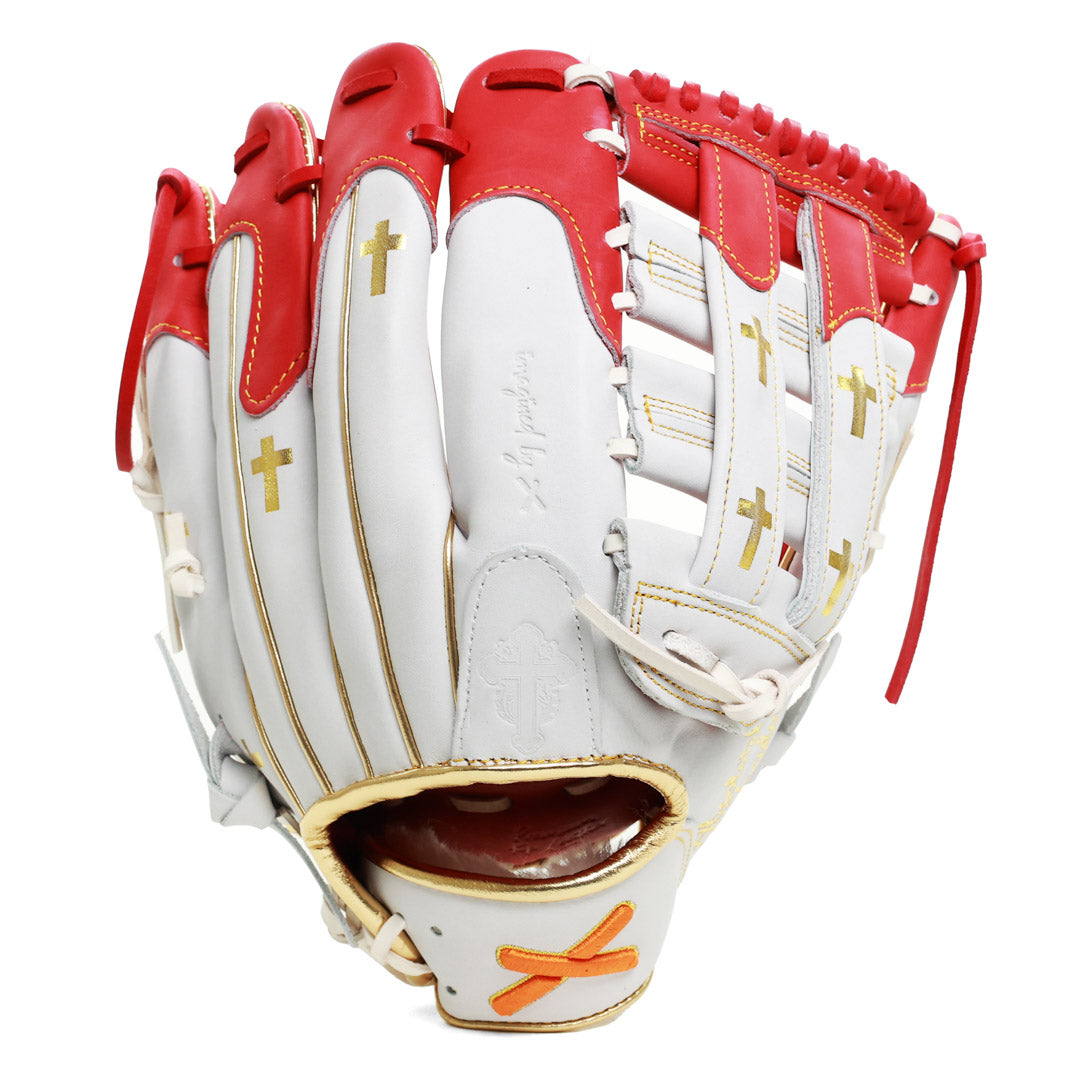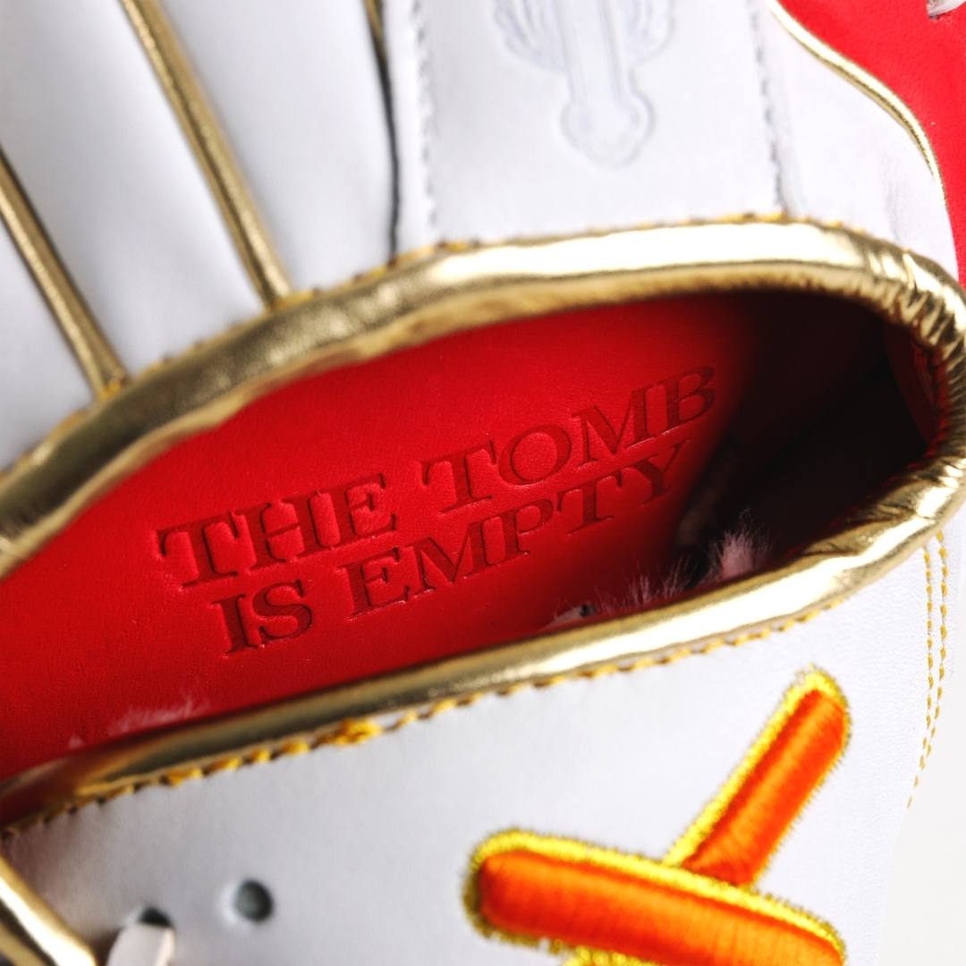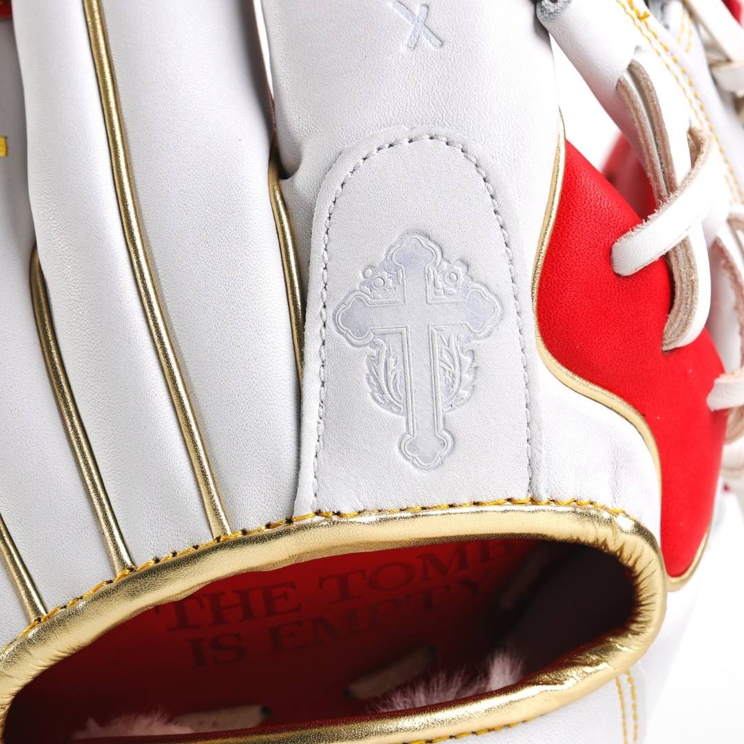 Gold crosses are placed throughout the piece, adding symbolism, while an ornate cross is embossed to the stitching of the finger pad with intricate precision. These serve as a reflection of the eternal beauty born from the sacrifice that was made three days before the Resurrection.
