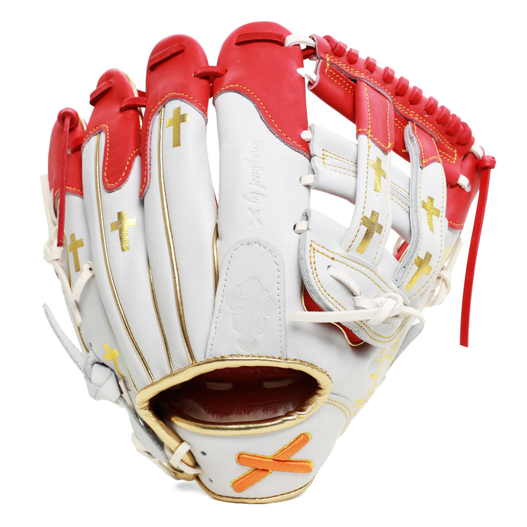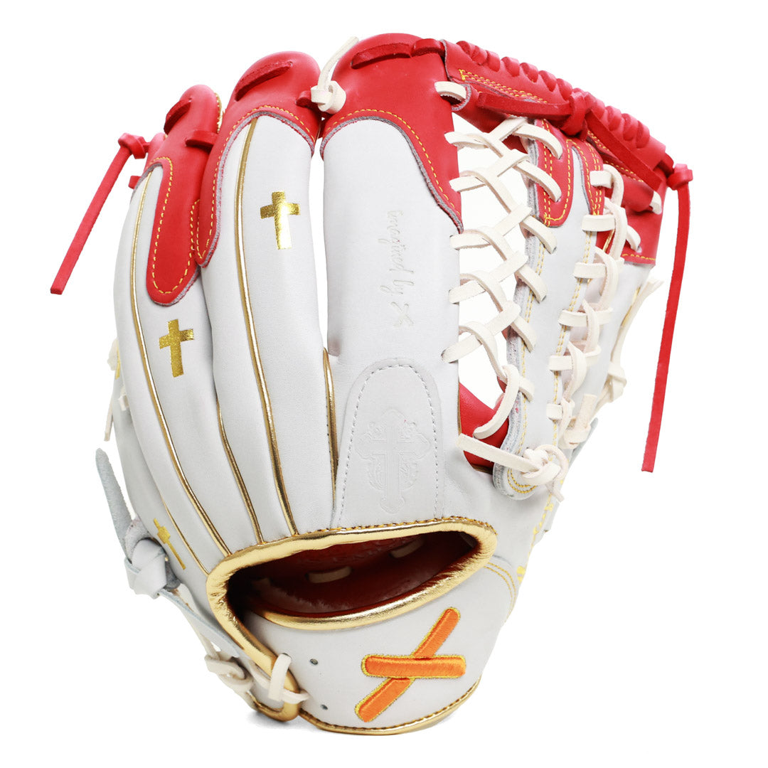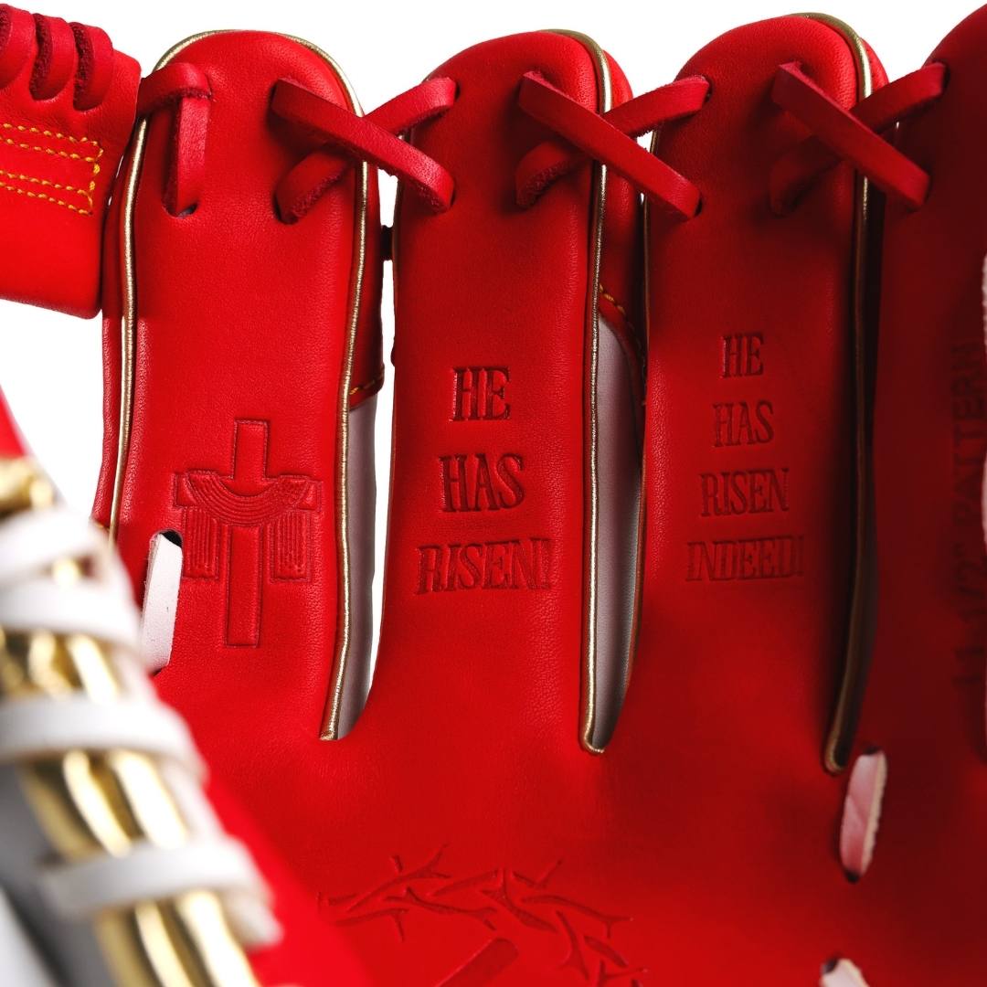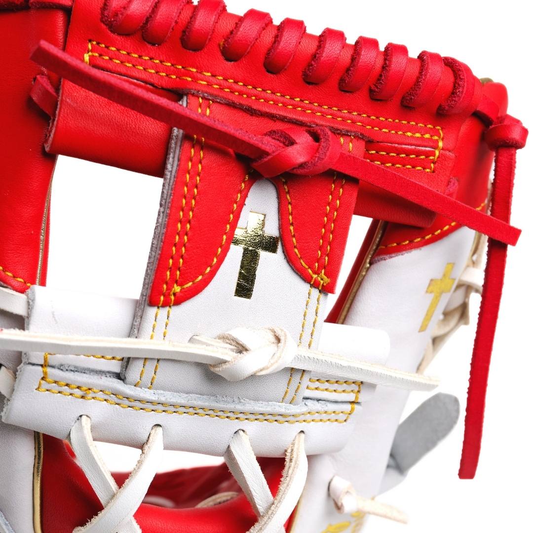 Gold crosses are placed throughout the piece, adding symbolism, while an ornate cross is embossed to the stitching of the finger pad with intricate precision. These serve as a reflection of the eternal beauty born from the sacrifice that was made three days before the Resurrection.