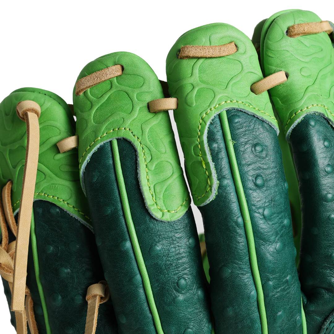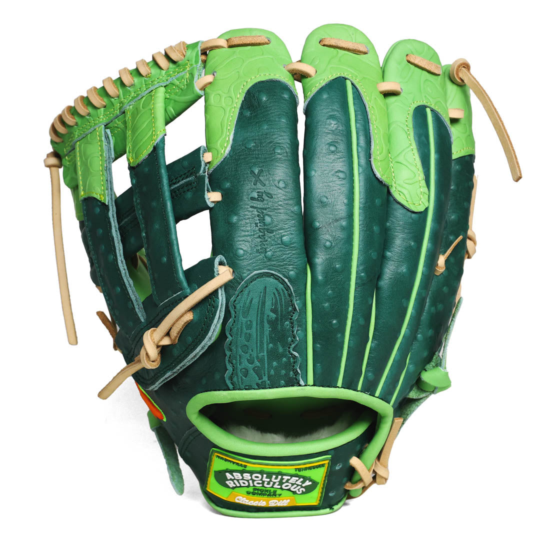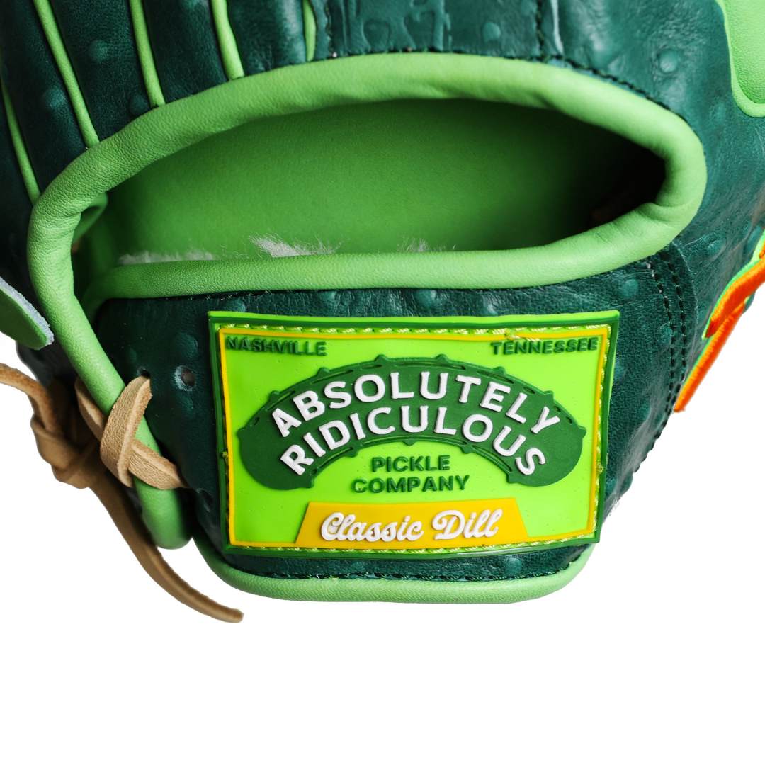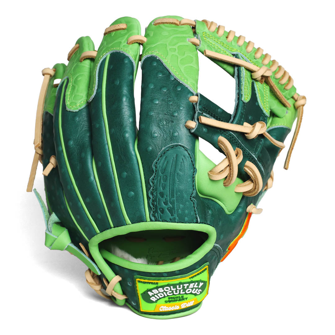 Dressed in deep dill green with crisp accent piping, the Pickle Softball Glove — crafted with high-quality leather features pickle-inspired accents and texture in the detailing.