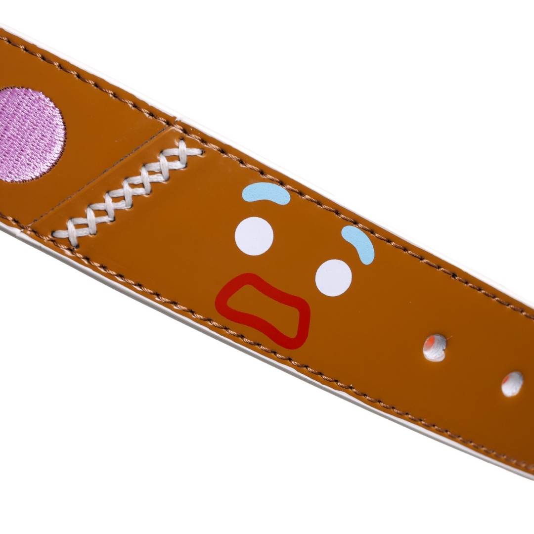 This limited run combines hand stitched cross stitch detailing, gloss print paint, debossing, and embroidery to bring the iconic Gingerbread Man theme to life. Frosting inspired details, purple gumdrop buttons, and a Gingy style character face are woven across the strap for a true functional art piece.