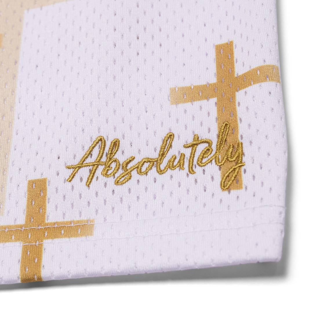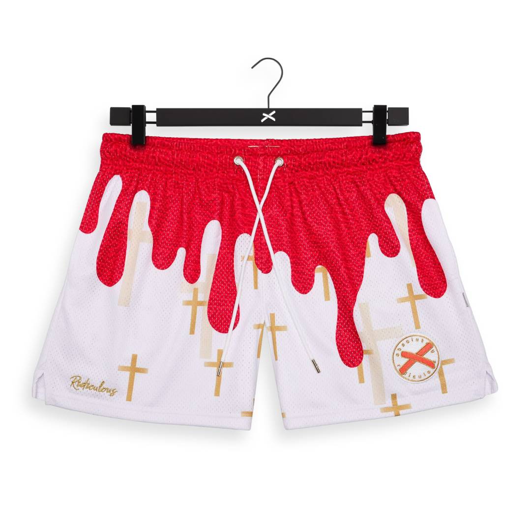 Built with the same obsession for detail and performance that defined the Resurrection collection. The premium tipped drawstrings, debossed eyelets, and a premium athletic mesh come together with an expressive design that blends the white-cloth base with bold red drip, and refined gold cross accents throughout the shorts.